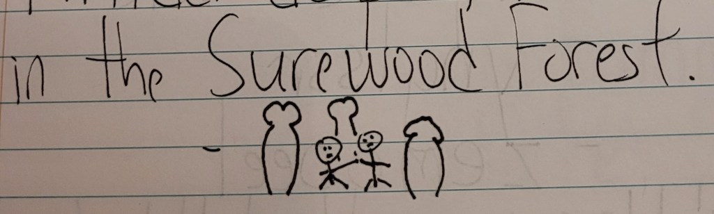 The tale, untitled, is a fairy tale, quite shapely for a spontaneous work, about a giant frog that eats little children. In it, two (inner) children – a timid Fear and a “timider” Despair – are lost in Surewood Forest, where all the trees are giant penises. They stumble onto the hut where the giant frog lives, and find him squatting outside, with a little boy in his mouth. The frog, of course, is ready with the standard three questions.